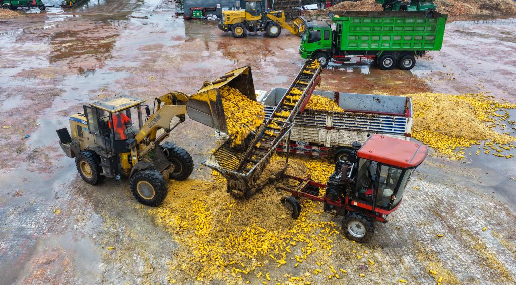 在山東省東營市廣饒縣一家糧食收儲企業(yè),工作人員在裝運玉米進(jìn)行脫粒(無人機(jī)照片)。(劉云杰 攝)