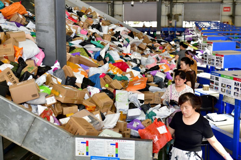 2025年6月18日,在山東省曹縣電子商務(wù)物流公共服務(wù)中心,工作人員在分揀快遞。新華社記者 郭緒雷 攝