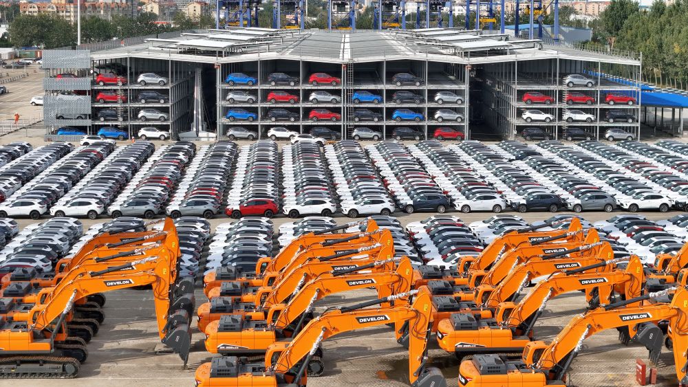 10月20日,國產(chǎn)汽車和工程機(jī)械在山東港口煙臺港集結(jié)等待裝船出口(無人機(jī)照片)。新華社發(fā)(唐克 攝)