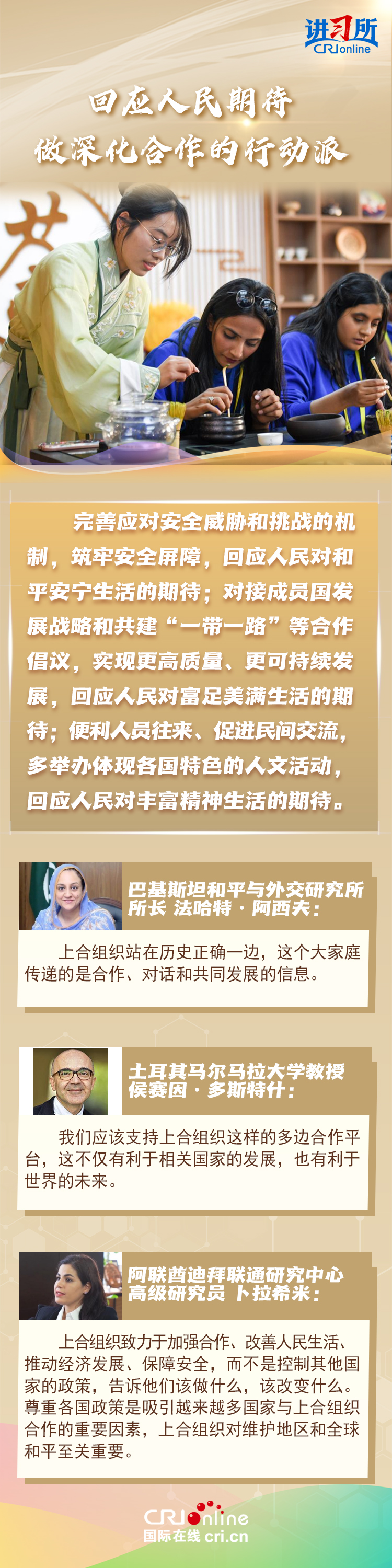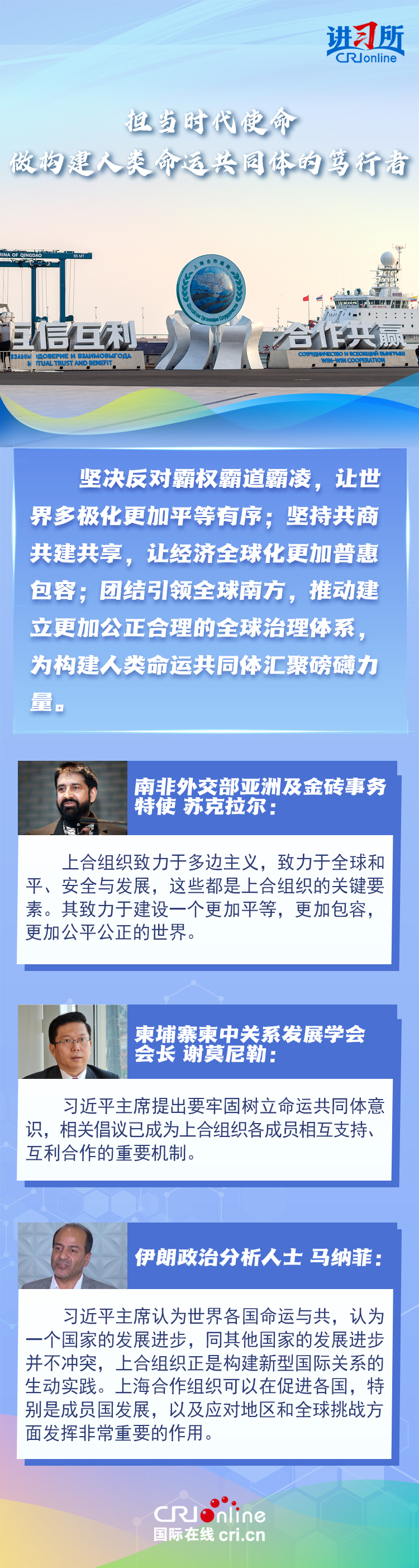 “讓‘上海精神’持續(xù)照亮構(gòu)建上海合作組織命運(yùn)共同體之路。”上海合作組織成立24年來,始終秉持“上海精神”,成功走出了一條順應(yīng)時代潮流、契合各方需求的區(qū)域合作道路,樹立起新型國際關(guān)系的典范。在國際人士眼中,上海合作組織站在歷史正確一邊,致力于建設(shè)一個更加平等,更加包容,更加公平公正的世界,對維護(hù)地區(qū)和全球和平至關(guān)重要。