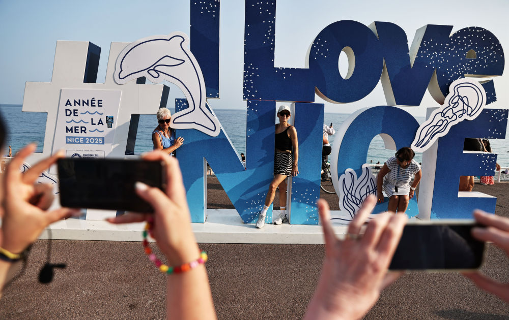 6月10日,在法國尼斯的盎格魯街上,人們在國際海洋年和第三屆聯(lián)合國海洋大會(huì)主題的景觀前拍照。新華社記者 高靜 攝