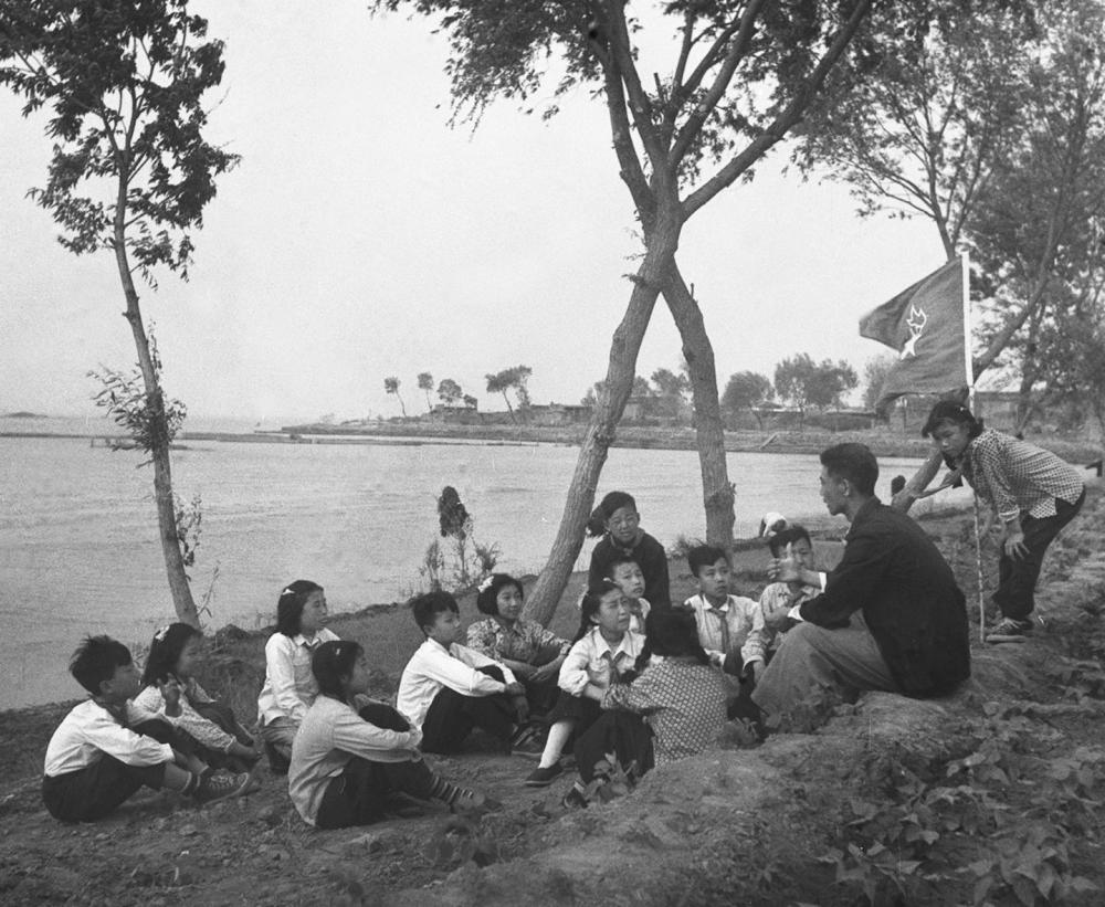 1955年,在河北白洋淀,新安小學的少先隊員們聽曾擔任過抗戰(zhàn)時期兒童團團長的陳殿元講抗戰(zhàn)故事。