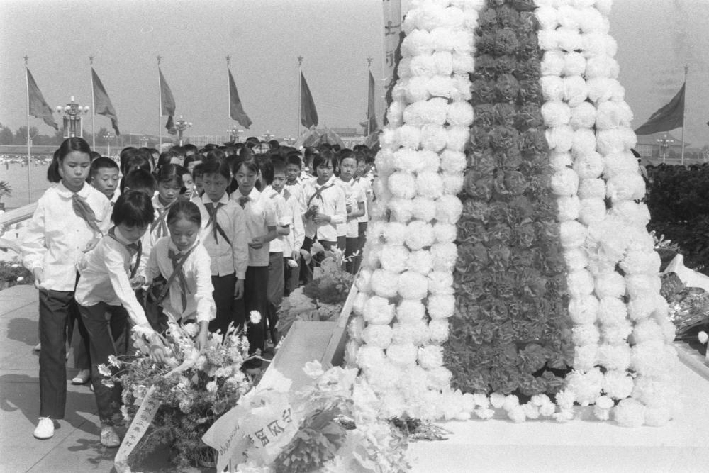 1985年,首都各界代表在天安門廣場人民英雄紀念碑前舉行獻花圈儀式,追念在抗日戰(zhàn)爭中犧牲的將士和死難同胞。這是海淀區(qū)少先隊員在敬獻花圈。