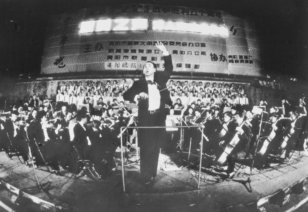 1995年8月15日,在貴陽市人民廣場舉行的萬人露天交響音樂會上,演員和萬余名市民高唱《義勇軍進行曲》。