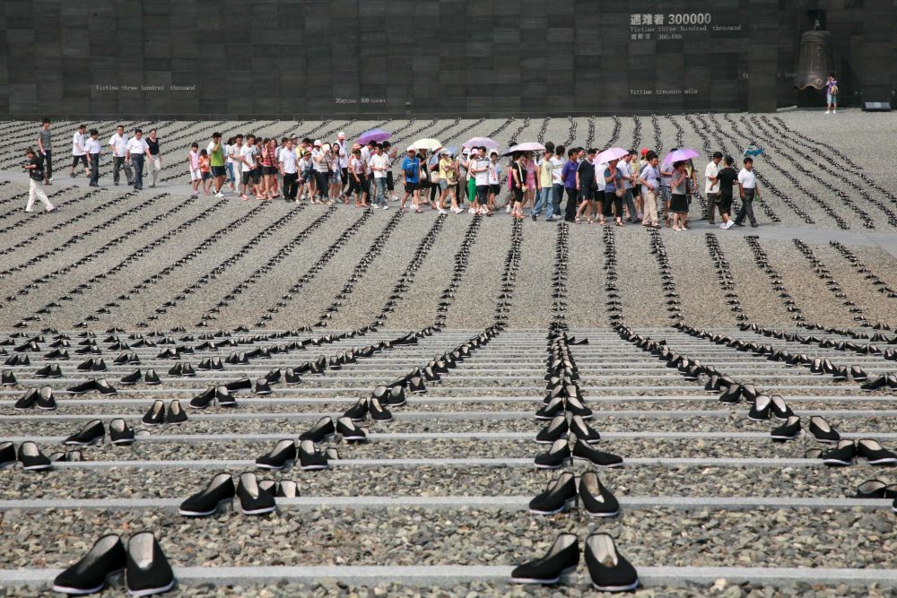 2010年8月15日,在侵華日軍南京大屠殺遇難同胞紀念館的和平公園,6830雙布鞋被整齊擺放,紀念在日本遇害的中國勞工。
