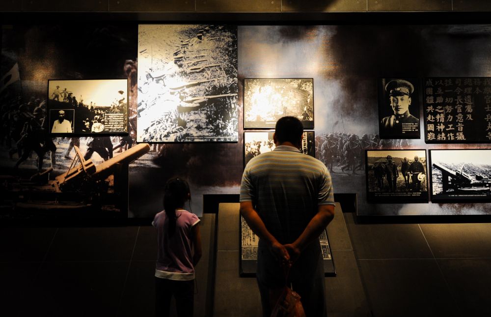 2013年8月15日,吉林省長春市各界人士來到位于偽滿皇宮博物院內(nèi)的東北淪陷史紀念館,參觀日本侵略中國東北史實展覽,緬懷抗戰(zhàn)英烈。這是一對父女在參觀展覽。