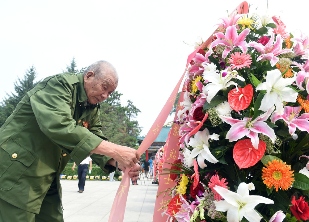 2015年8月15日,吉林省紀念東北抗聯(lián)精神大會在吉林通化舉行,各界群眾來到通化市楊靖宇烈士陵園,緬懷犧牲的東北抗聯(lián)將士。這是一位東北抗聯(lián)老戰(zhàn)士為烈士敬獻花圈。