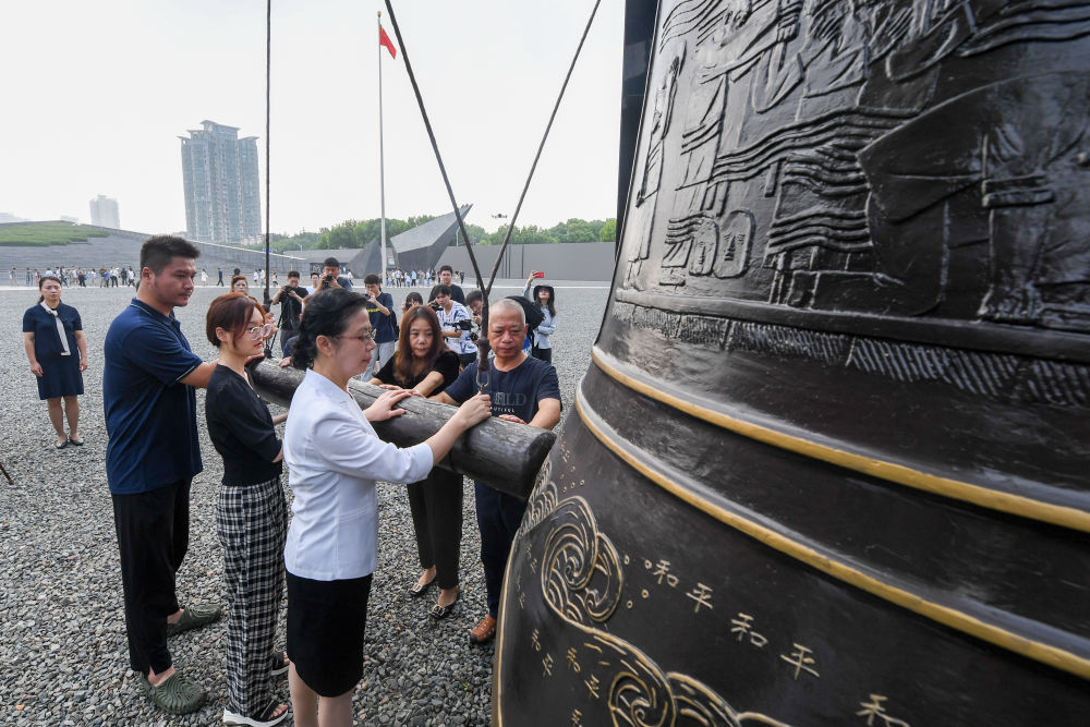 2023年8月15日,南京大屠殺幸存者后代代表在侵華日軍南京大屠殺遇難同胞紀念館公祭廣場撞響和平大鐘,祈福和平。