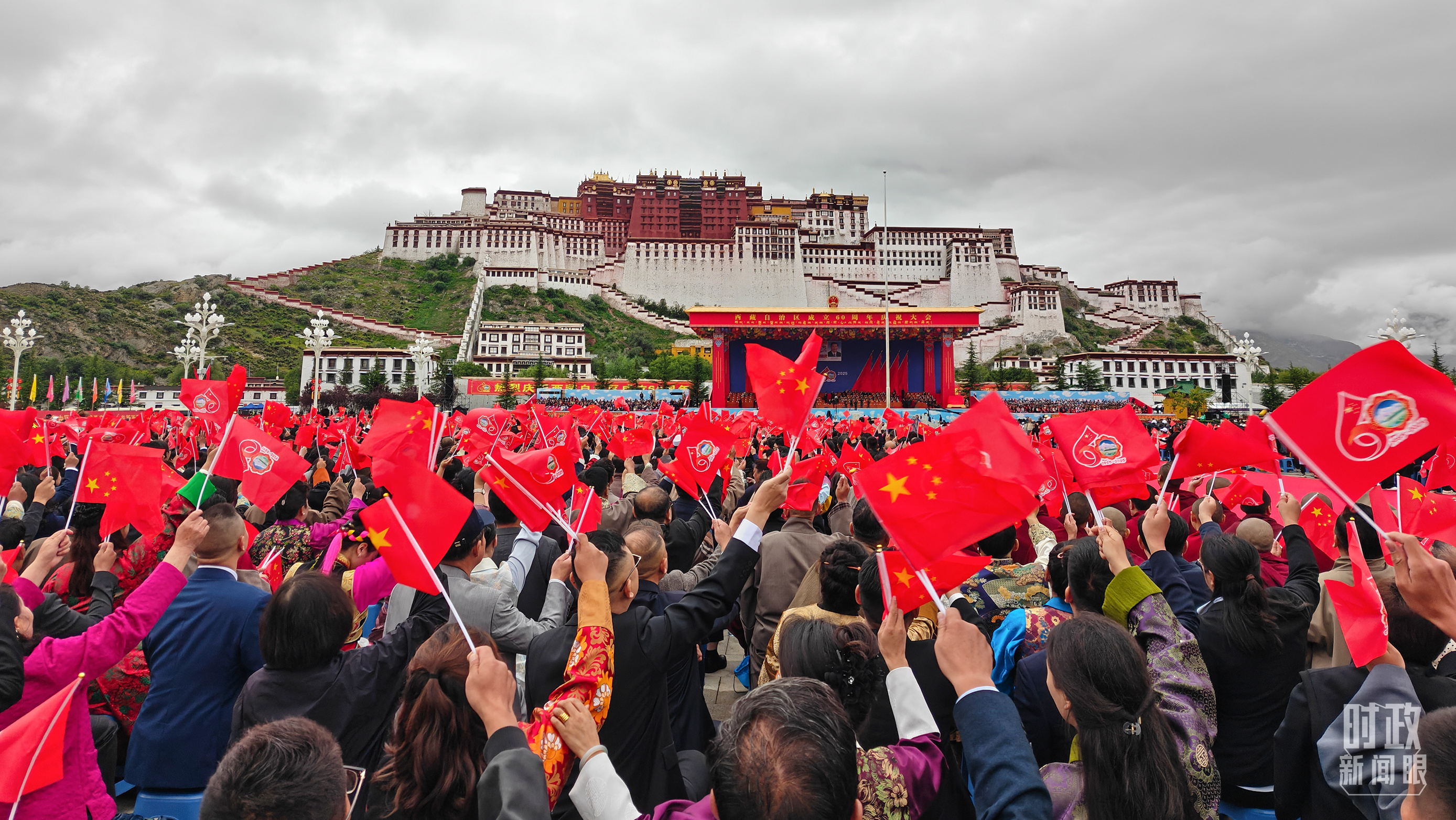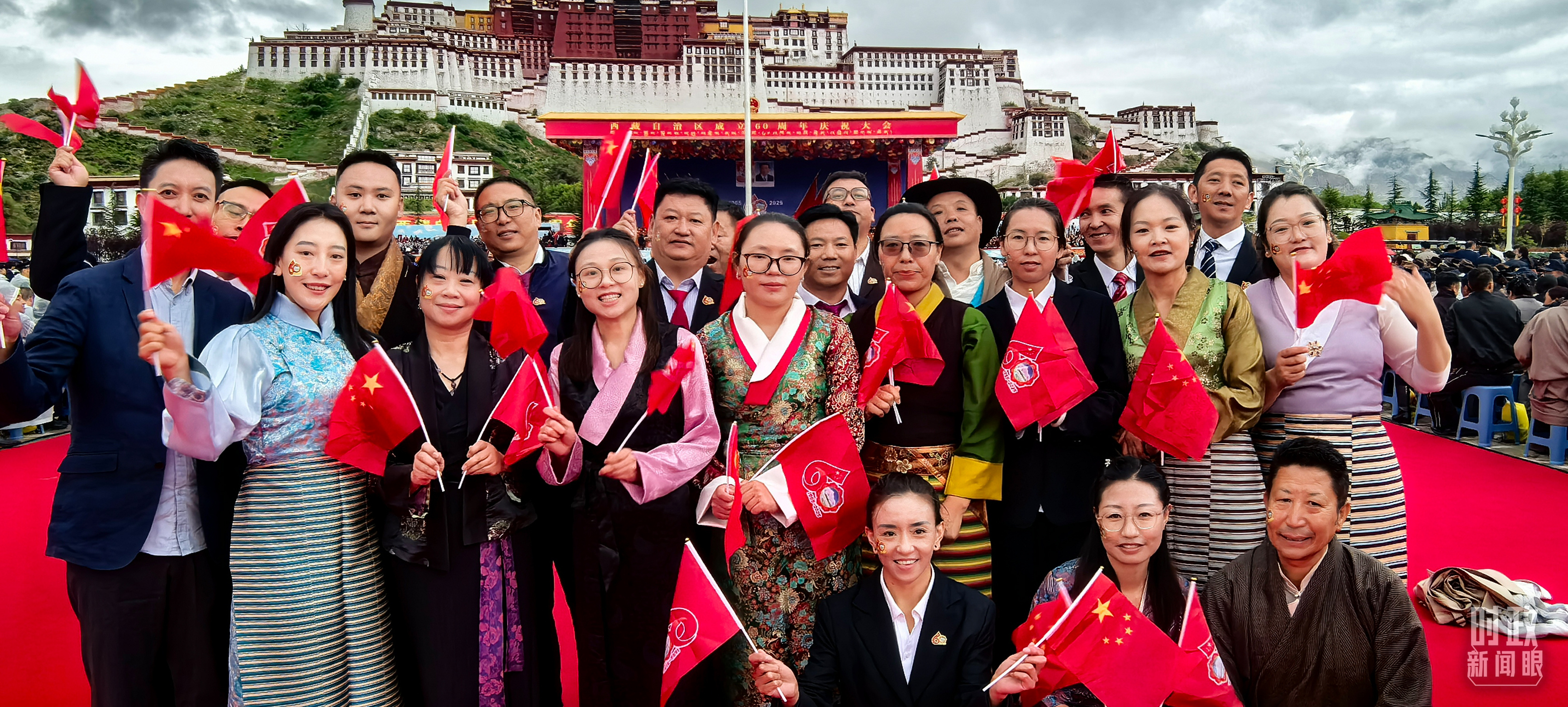 慶祝大會的會場設(shè)置在雄偉的布達(dá)拉宮前,位于群山環(huán)抱之中。大會主席臺采用藏式風(fēng)格。約2萬人歡聚布達(dá)拉宮廣場,紅、黃、白、藍(lán)等體現(xiàn)藏族文化基因的色彩鋪滿眼前,烘托出吉祥喜慶的濃烈氛圍。
