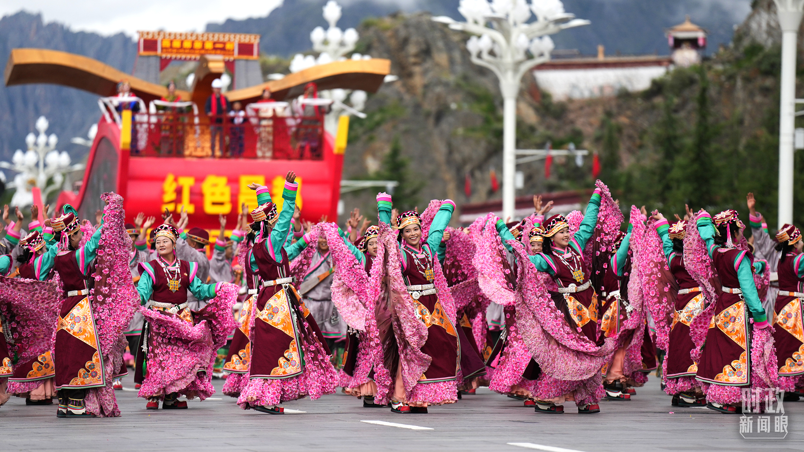 六十載櫛風(fēng)沐雨,一甲子滄海桑田。格?;êH何柚校茡P的扎念琴聲響起,雄渾的甲諧舞、瓊結(jié)卓舞、弦子舞、鍋莊舞、普蘭宣舞應(yīng)接不暇,舞出西藏繁榮發(fā)展的精氣神。身穿工布服飾、飛天服飾等藏族特有服飾的游行群眾,以一場非物質(zhì)文化遺產(chǎn)的盛宴向西藏自治區(qū)成立60周年獻(xiàn)禮。