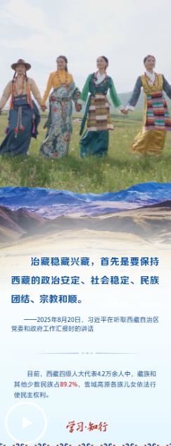 2025年8月20日,習近平總書記率中央代表團乘專機抵達拉薩,出席西藏自治區(qū)成立60周年慶?;顒?。在聽取西藏自治區(qū)黨委和政府工作匯報時,習近平總書記強調(diào),“持續(xù)深入抓好穩(wěn)定、發(fā)展、生態(tài)、強邊四件大事,努力建設團結富裕文明和諧美麗的社會主義現(xiàn)代化新西藏”。