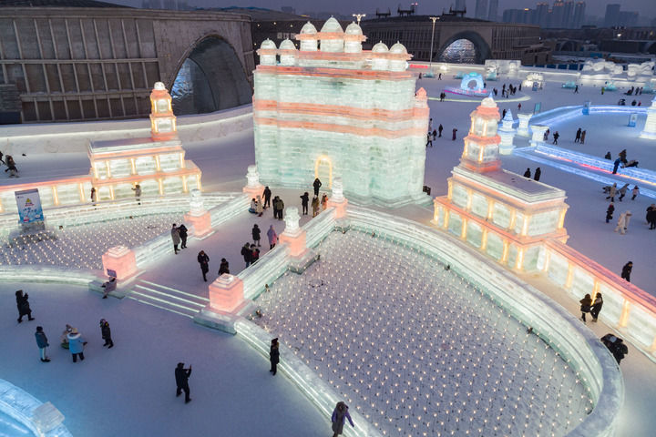 2023年2月1日,游客在哈爾濱冰雪大世界園區(qū)冰雪景觀《勝利之城》周邊游玩,該冰雪景觀以印度的法塔赫布爾西格里城為原型設(shè)計建造(無人機照片)。此屆哈爾濱冰雪大世界將上合組織成員國的特色建筑以冰雪景觀的形式呈現(xiàn)。新華社記者 謝劍飛 攝