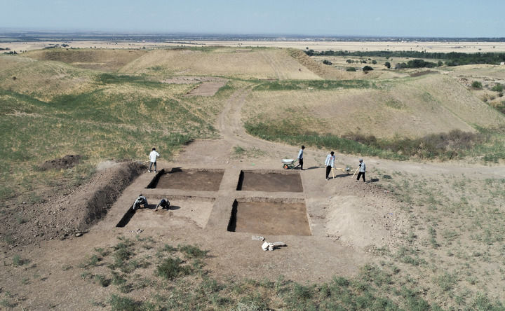 2023年8月9日,考古人員在中哈聯(lián)合考古項目拉哈特遺址探方上工作(無人機照片)。新華社發(fā)(奧斯帕諾夫攝)