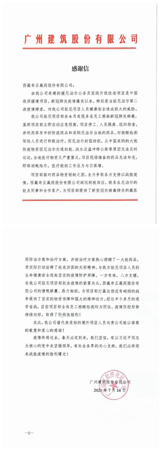 患者經(jīng)多次核酸檢測(cè)轉(zhuǎn)陰未復(fù)陽后,廣州建筑集團(tuán)特地給西藏奇正藏藥股份有限公司寫了一份感謝信,信中寫到:西藏奇正藏藥股份有限公司為項(xiàng)目部提供了新型冠狀病毒肺炎的藏醫(yī)藥防治方案和治療方案,并按治療方案熱心捐贈(zèng)了一大批藥品,用實(shí)際行動(dòng)詮釋了扶危濟(jì)困的光彩精神,為我方駐尼項(xiàng)目人員的生命健康安全筑起堅(jiān)實(shí)的疫情防護(hù)屏障。一方有難,八方支援,在我公司駐尼項(xiàng)目部抗擊疫情的緊要關(guān)頭,西藏奇正藏藥股份有限公司的慷慨解囊、鼎力相助,為項(xiàng)目部打贏這場沒有硝煙的戰(zhàn)爭提供了堅(jiān)實(shí)的物資保障和強(qiáng)大的精神動(dòng)力。