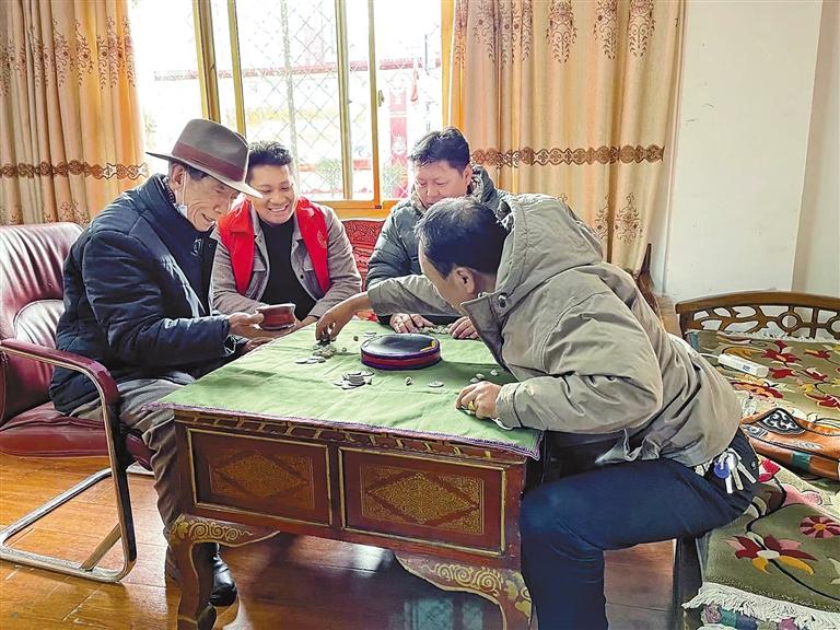 圖為74歲的次仁朗杰老人和朋友在魯固社區(qū)養(yǎng)老服務(wù)驛站玩藏式骰子游戲。記者 央金 攝