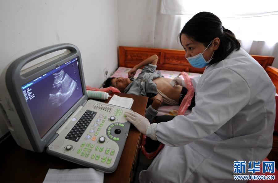 安徽省援藏醫(yī)療人員在西藏山南市錯(cuò)那縣勒門巴民族鄉(xiāng)為當(dāng)?shù)卮迕馚超檢查腹腔,進(jìn)行包蟲(chóng)病篩查(2017年8月7日攝)。新華社記者 晉美多吉 攝