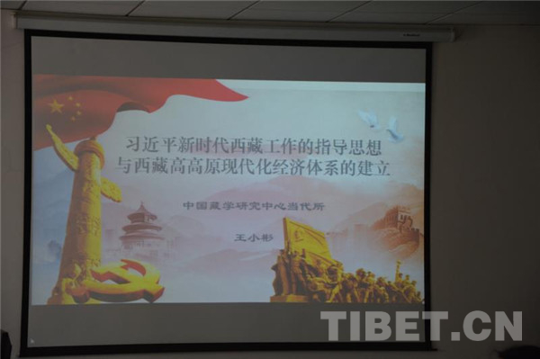 圖為王小彬作題為《習近平新時代西藏工作的指導思想與西藏高高原現(xiàn)代化經(jīng)濟體系的建立》的報告。