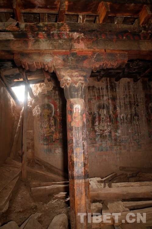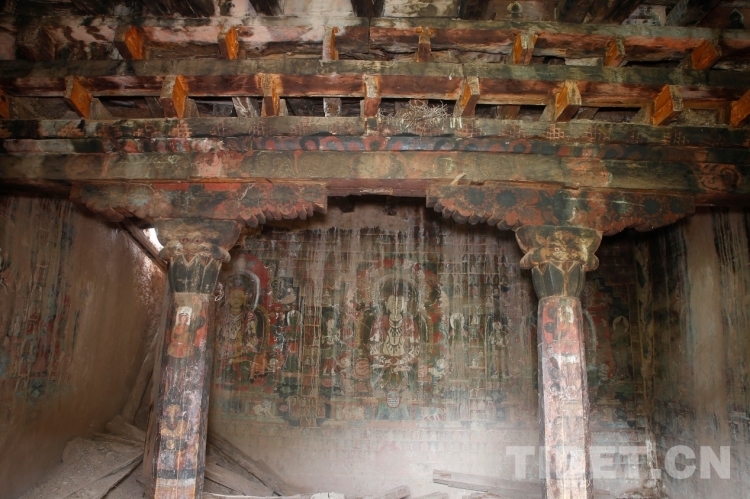 現(xiàn)存的薪日寺為兩層的夯土建筑,上下兩層之間無(wú)連接通道,上層無(wú)壁畫,壁畫位于下層。下層四壁均繪有壁畫,其保存狀況因漏雨、滲水、破壞等各種原因而不是太好。墻面寬550CM,長(zhǎng)570CM,高325CM,壁畫通高278CM。中央有立柱兩根,從立柱上的橫梁破壞壁畫完整性的角度來(lái)分析,它應(yīng)是為了保護(hù)整體建筑的安全,于后期在一次“大揭頂”式的維修中設(shè)立的。