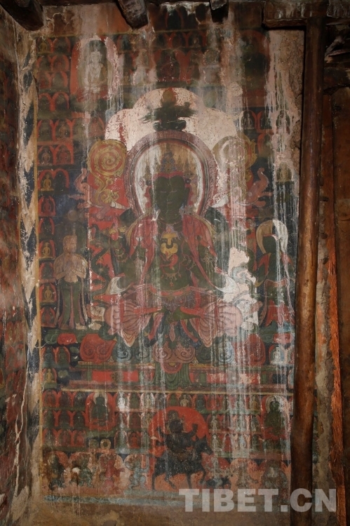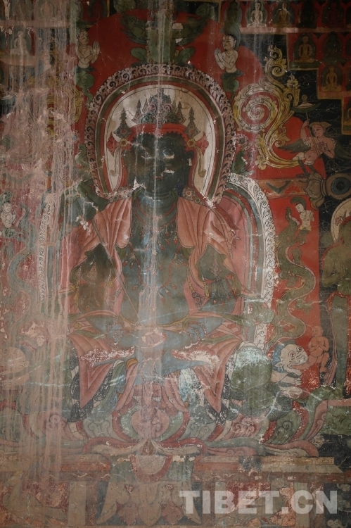第二壁共有三鋪壁畫,其中第三鋪壁畫為瓦塞昂巴(?????????????)組合,其左側(cè)受雨水浸蝕,其伴神已不可辨識(shí)。第四鋪壁畫為普賢寂靜總集(?????????????????????),其造像最上兩首被橫梁所破壞。第五鋪壁畫浸蝕嚴(yán)重,其主尊已不可辨識(shí)。