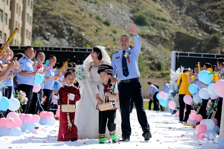 戍守邊境是使命,與相濡以沫的另一半攜手戍邊則成了最特別的浪漫。在婚禮現(xiàn)場,有一對穿著彝族和藏族服飾的花童引人注目?;ㄍ砗蟮男吕珊挠钍菑脑氐搅舨氐囊妥迕窬履锎蔚┭胱趧t是土生土長的藏族民警。這對“新人”的聯(lián)姻,既體現(xiàn)了民族團結與融合,更展示了西藏移民管理警察扎根奉獻邊疆的誓言和決心。