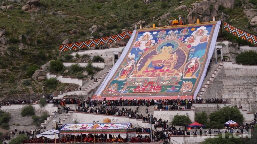 中國西藏網(wǎng)訊 8月4日,哲蚌寺背后的半山腰上,伴著莊嚴(yán)的法號(hào)聲,巨幅釋迦牟尼像唐卡緩緩展開,吸引著數(shù)以千計(jì)的信教群眾和來自世界各地的游客,場面蔚為壯觀。