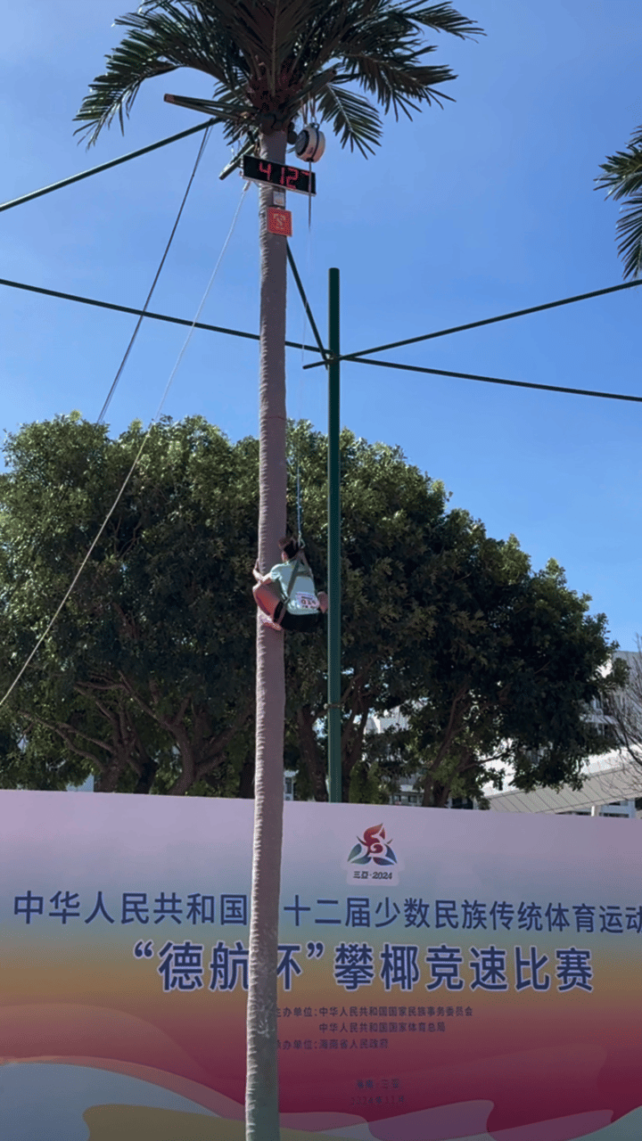 攀椰競速設(shè)立男子攀椰9米競速和女子攀椰7米競速兩個項目,比賽要求運動員使用統(tǒng)一提供的攀椰運動用具,徒手攀爬至椰樹頂部并按下計時器,用時短者獲勝。