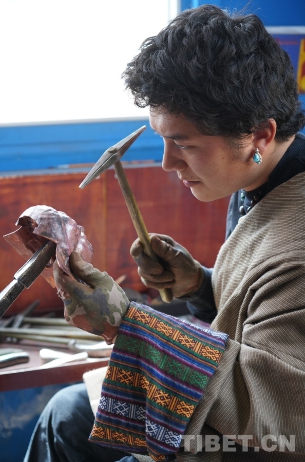 再次見到朗加時,他緩步向我走來,臉上掛著陽光般溫暖的笑容,眼神澄澈而深邃。他身著極具藏族特色的紅色繡花馬甲,這件馬甲是朗加讀小學(xué)時,母親得知朗加要在學(xué)校表演鍋莊舞,特地親手為他制作的,當(dāng)時母親特意做大了些,誰也未曾想到竟一直穿到今天。十幾年過去了,繡花馬甲依舊完好如初。這也不再只是一件馬甲,更是母親的愛和溫暖,一直伴隨著朗加無數(shù)個日夜,陪伴他奔赴遠(yuǎn)方,在傳承巴爾瑪錘揲法造像技藝的道路上走得越來越遠(yuǎn)。(中國西藏網(wǎng) 文/鄒慧)