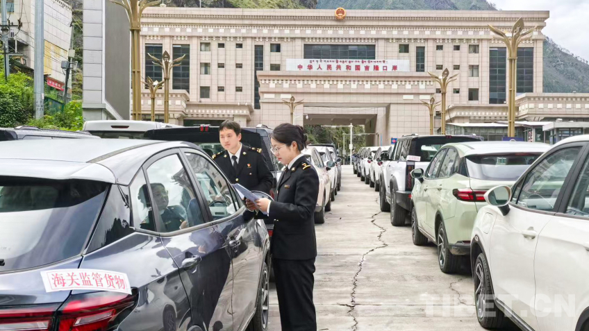 圖為海關工作人員在吉隆口岸對出口新能源汽車進行查驗 圖片由拉薩海關提供