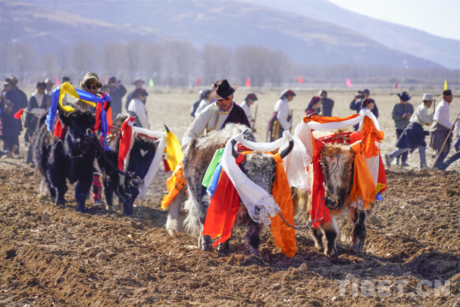 祈福儀式后,極具民族特色的二牛抬杠耕作表演精彩上演。來自三個片區(qū)的耕作者身著藏繡華服,用哈達(dá)裝飾耕牛,以傳統(tǒng)木犁翻土開壟,在雄渾的勞動號子中,勾勒出千年農(nóng)耕文明的鮮活圖景。