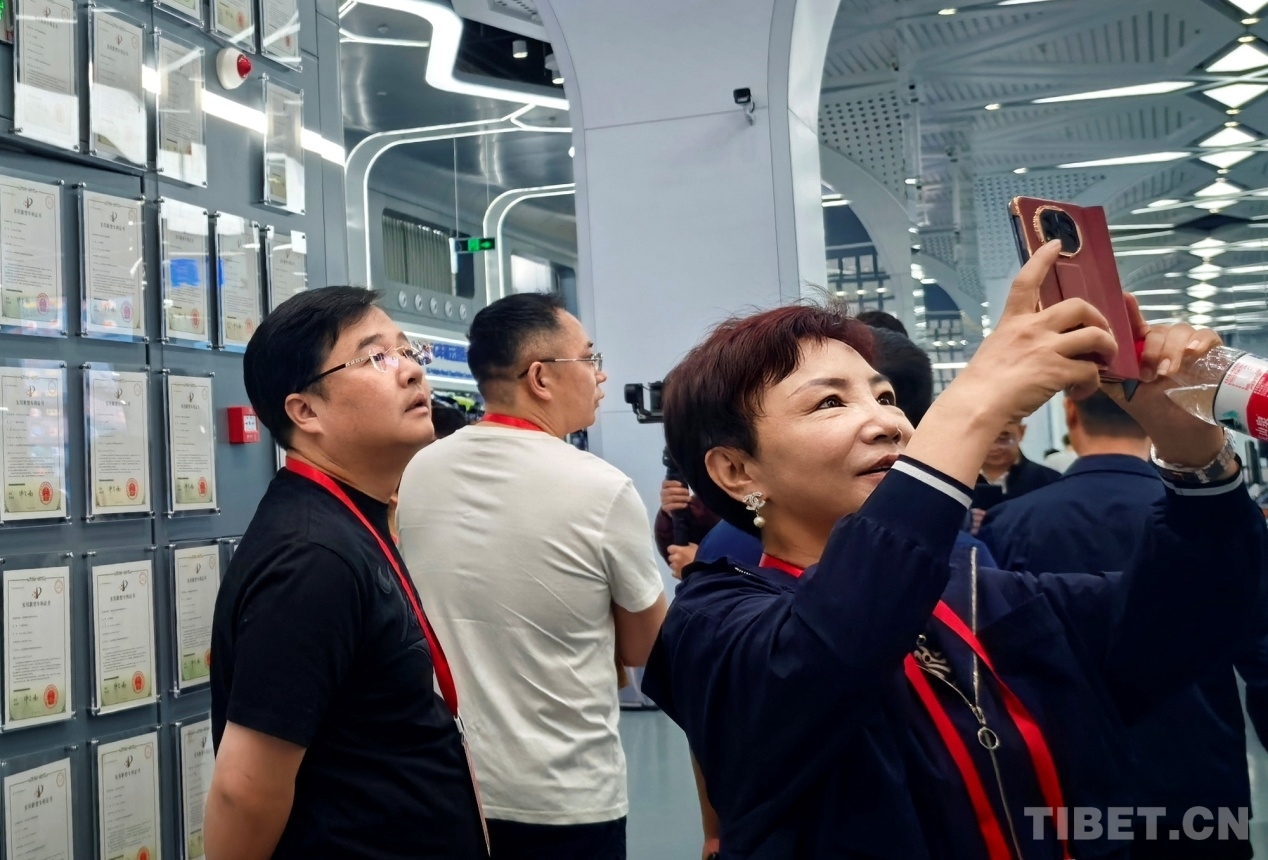 圖為全國(guó)政協(xié)委員、西藏自治區(qū)工商聯(lián)副主席、西藏青年企業(yè)家商會(huì)會(huì)長(zhǎng)、西藏眾源建材集團(tuán)有限公司董事長(zhǎng)卓嘎(右一)在北方國(guó)際汽車教育展廳+實(shí)操教室拍攝發(fā)明專利證書 攝影:劉莉