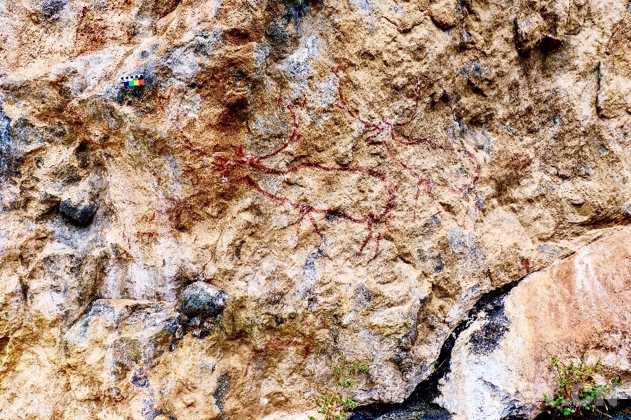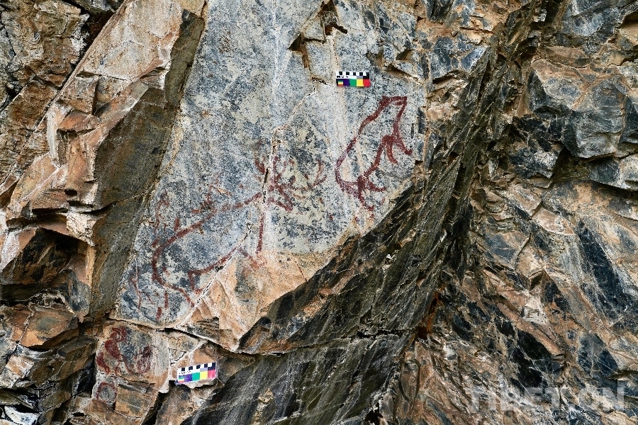 周行康:2023年6月,在海子山管委會(huì)巡山團(tuán)隊(duì)提供線(xiàn)索指引下,經(jīng)過(guò)數(shù)次實(shí)地調(diào)查,我們?cè)凇昂W由?格聶”區(qū)域發(fā)現(xiàn)了紅顏料涂繪類(lèi)巖畫(huà)群。通過(guò)邀請(qǐng)國(guó)內(nèi)考古權(quán)威機(jī)構(gòu)來(lái)現(xiàn)場(chǎng)采樣、并經(jīng)實(shí)驗(yàn)室測(cè)定,我們確認(rèn)這批巖畫(huà)是距今8000年前的古老創(chuàng)作。目前從世界范圍來(lái)看,石刻類(lèi)巖畫(huà)的測(cè)年還沒(méi)有得到一個(gè)有效的解決,青藏高原的石刻類(lèi)巖畫(huà),一般推斷為距今3000多年,因而這批更久遠(yuǎn)的舊石器時(shí)代的“海子山-格聶”巖畫(huà)就顯得更有意義,而且它是目前已知的世界上同類(lèi)風(fēng)格巖畫(huà)中海拔最高的巖畫(huà)——位于海拔4721米的高度。