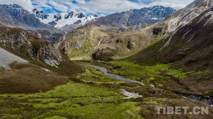 圖為2023年6月24日拍攝的甘孜州“海子山-格聶巖畫(huà)群”大環(huán)境,遠(yuǎn)處為格聶群峰