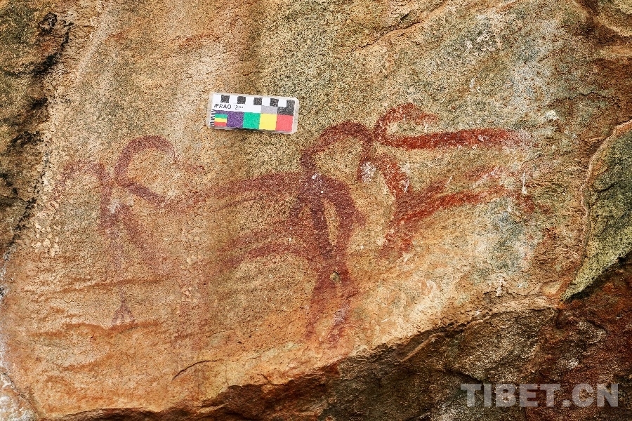 周行康:西藏7地市里,阿里地區(qū)的巖畫(huà)得到比較早的發(fā)現(xiàn)與重視,20世紀(jì)90年代考古學(xué)家在做其他考古項(xiàng)目時(shí)發(fā)現(xiàn)了這個(gè)現(xiàn)象并進(jìn)行了一定的研究,然后是包括那曲在內(nèi)的廣義羌塘地區(qū)。青海玉樹(shù)州的巖畫(huà)在十年前開(kāi)始得到比較多的重視,主要是本地的藏族同志在認(rèn)真地調(diào)查研究。最近三、四年,甘孜州的巖畫(huà)在當(dāng)?shù)卣匾?、?zhuān)家學(xué)者的參與下進(jìn)入上升趨勢(shì),甘孜州涂繪類(lèi)巖畫(huà)的測(cè)年工作是走在青藏高原巖畫(huà)研究前列的。目前看青藏高原西、中、東三個(gè)重要點(diǎn)位已具備規(guī)模和形態(tài)。