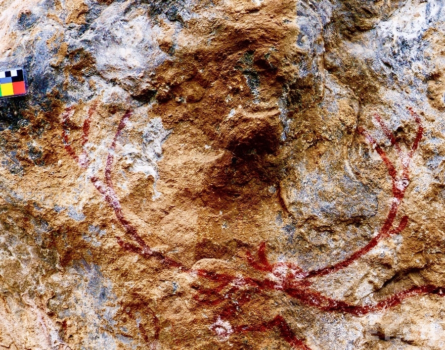 圖為2023年6月24日拍攝的甘孜州“海子山-格聶巖畫(huà)群”海1巖畫(huà)中獨(dú)特的野豬、人物、爪印圖像