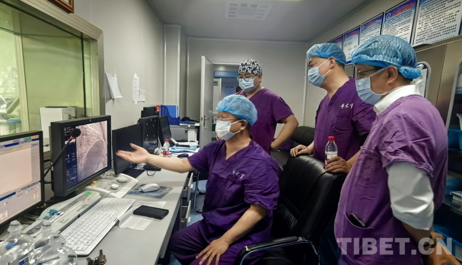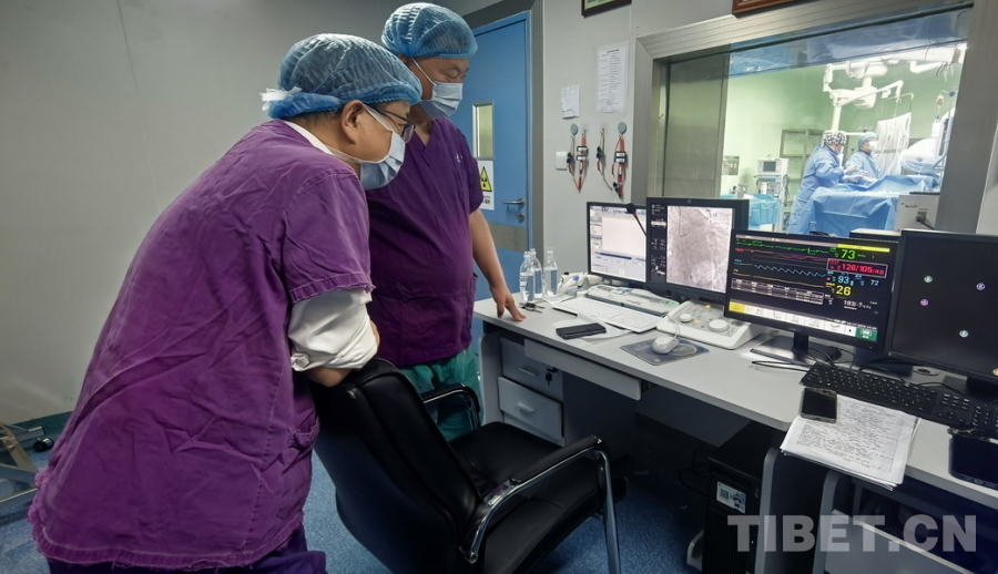 圖為陰赪茜(手術(shù)室內(nèi)右)趕赴阿壩州人民醫(yī)院手術(shù)救治急性心梗患者,屏幕上顯示出陰赪茜正操作纖細的導(dǎo)絲嘗試通過患者發(fā)生閉塞的心臟血管 攝影:劉莉
