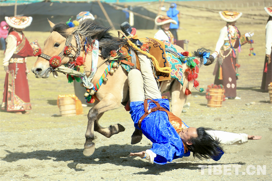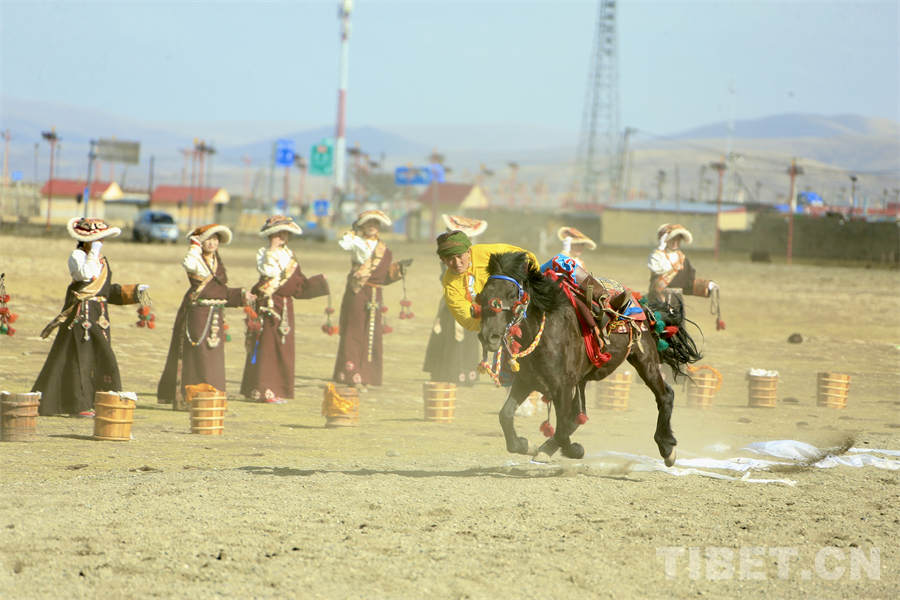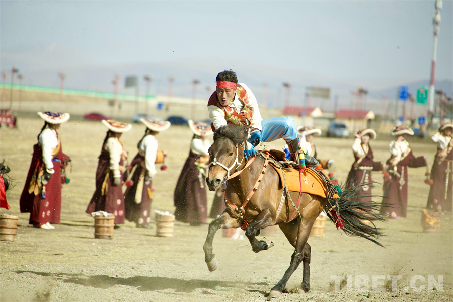 在海拔4000米左右的遼闊天地間,康巴漢子們駕馭著矯健的駿馬、身著華美的傳統(tǒng)服飾,如疾風(fēng)般掠過金色的草原,在馬背上展示跑馬射箭、乘馬射擊、跑馬拾哈達、跑馬倒立、跑馬懸體等高難度動作,馬蹄聲聲、歡呼陣陣,交織成高原最豪邁的樂章。(中國西藏網(wǎng) 記者/畢然 龍真多吉)