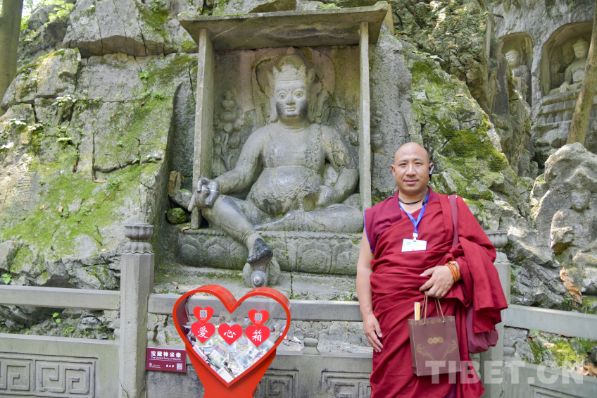 “雖然我已經在飛來峰講解了許多年,但始終不知道這尊藏傳佛教財神爺在藏語中的發(fā)音怎么讀,今天有幸向各位請教?!痹陟`隱寺飛來峰的理公塔旁,一處坐南朝北、呈縱長形的佛龕內供奉著一尊菩薩坐像,這是元代所雕刻出的藏傳佛教黃財神造像。隨團導游小李正趁此機會向來自西藏的師生們請教,來自西藏的他們亦同樣為在杭州能看到如此大規(guī)模的藏傳佛教造像感到驚訝。