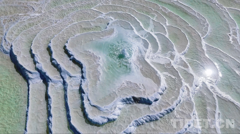 圖為察爾汗鹽湖內(nèi)的鹽池。在一些將要干涸的鹽池上,湖水表面會飄蕩著鹽花結(jié)晶,同時池底也會結(jié)晶為層層鹵石,這種鹵石的硬度很高,性質(zhì)也較為穩(wěn)定,足以修建成道路供行人車輛通行 供圖:青海省文化和旅游廳