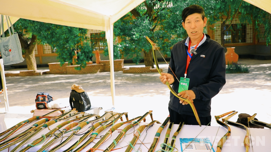 馬國財是一位來自青海省海東市樂都區(qū)的南山傳統(tǒng)牛角弓非遺傳承人,自曾祖父起他家在制作牛角弓方面的技藝是家喻戶曉的。他深受父輩的影響,做弓技藝更是嫻熟。此次活動,他帶來了自己的幾十張得意之作“南山傳統(tǒng)牛角弓”,在現(xiàn)場向?qū)ε=枪信d趣的游客耐心地講解選材、打磨、粘合、鋪筋、扎把、陰干、調(diào)試、加牛角、打磨、貼樺皮、上色等弓箭的制作過程,以及在生活當(dāng)中的實際應(yīng)用,讓更多的人了解到它不僅僅是一張普通的弓,更是祖祖輩輩的智慧結(jié)晶和珍貴非遺。