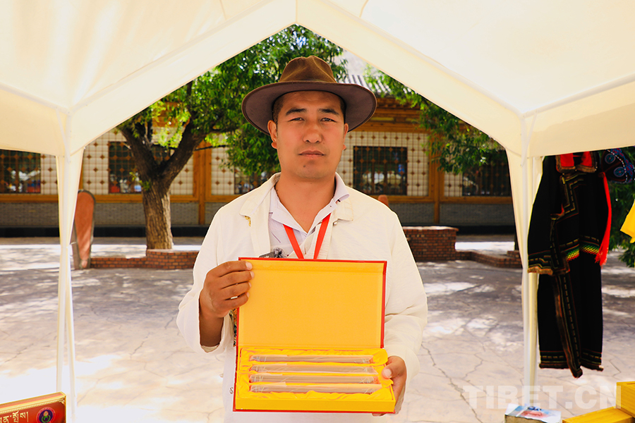 “我今天主要帶來的是我們的工藝產(chǎn)品‘供養(yǎng)藏香’,這些包裝樣式不一的藏香根據(jù)規(guī)格大小都有各自的價位,但每一根藏香上付出的心血及所使用的工藝和配料都一致,其中我們也更注重藏香的配料,都是精心篩選的白檀香、藏紅花、安息香、白黑沉香、甘松等二十多種源自高原的天然藥物和香味植物?!碑?dāng)問到目前的銷售情況時,他坦言道:“今天賣出去的并不是很多,不過今天能和眾多的優(yōu)秀手工藝人同臺參展機會難得,對我來說也是一種學(xué)習(xí)和展現(xiàn)的契機?!?/p>