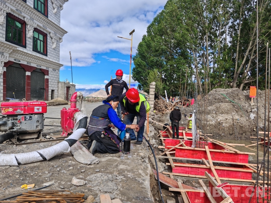 在仲康村巴桑家的重建工地上,工程已進(jìn)入鋼筋捆扎階段。一場(chǎng)突如其來(lái)的夜雨導(dǎo)致基坑積水。清晨七八點(diǎn),施工隊(duì)員已在基坑中忙碌開(kāi)來(lái),有的加緊捆扎鋼筋,有的尋找水泵抽水。日頭漸高,汗水浸濕了工人們的額頭,他們卻無(wú)暇休息。這時(shí),阿媽巴桑提著一壺剛煮好的甜茶走來(lái),就地一杯杯沏好,熱情地招呼這群“小伙子”?!耙郧暗睦戏孔诱饓牧耍F(xiàn)在黨和政府給我們建更好的新房子,日子肯定越過(guò)越有盼頭!”樸實(shí)的話語(yǔ)里,滿是她對(duì)未來(lái)的憧憬和對(duì)援助的感激。