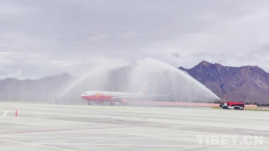 圖為8L9669航班在拉薩貢嘎國(guó)際機(jī)場(chǎng)穿過“水門”