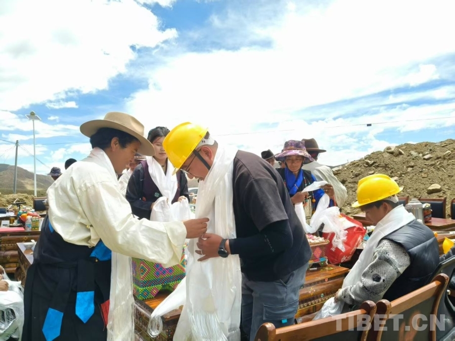 圖為村民向施工隊工作人員敬獻哈達(dá)。