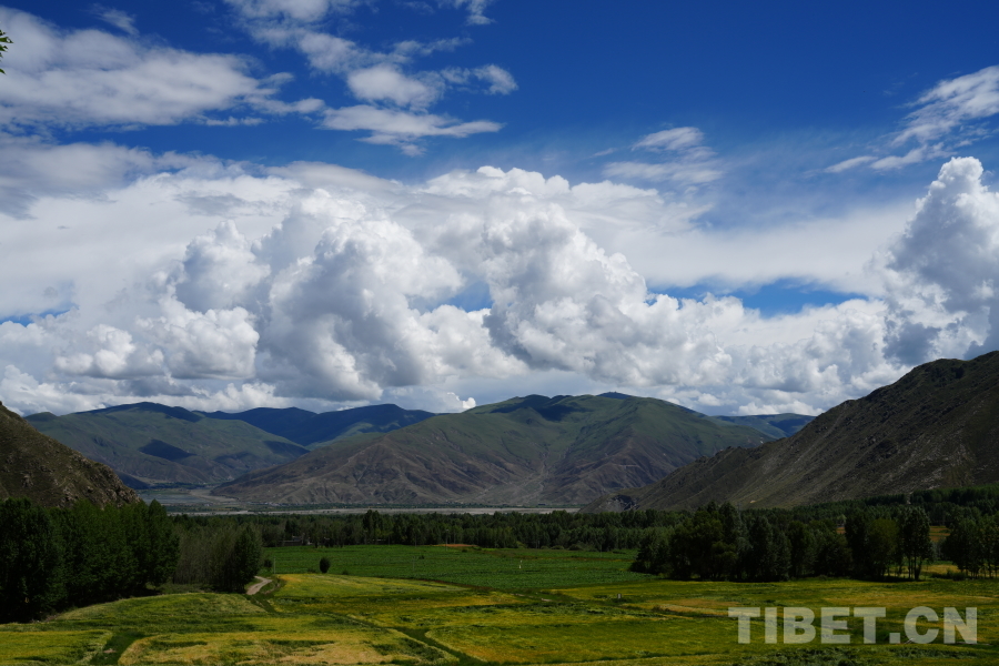 中國(guó)西藏網(wǎng)訊 站在觀景臺(tái)遠(yuǎn)眺,綠樹成蔭,一陣風(fēng)吹過(guò),麥浪金黃;漫步色甫林卡,帳篷搭建得整整齊齊,牛羊悠閑地曬太陽(yáng);走進(jìn)望果賽馬場(chǎng),當(dāng)?shù)厝罕娨言缭缵s來(lái)搭建帳篷,各家各戶其樂(lè)融融。