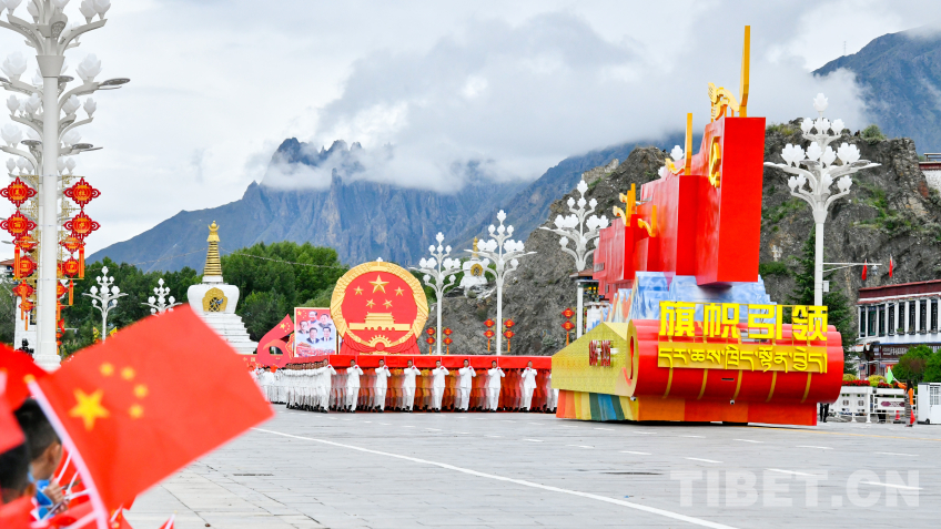 “旗幟引領(lǐng)”彩車,車頭矗立巨型黨旗,八面五星紅旗有序排列其后,展現(xiàn)了在黨中央堅(jiān)強(qiáng)領(lǐng)導(dǎo)下,西藏各族兒女同心同向、團(tuán)結(jié)奮進(jìn)的時(shí)代圖景。