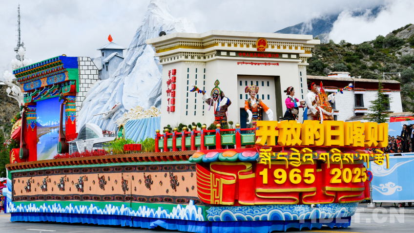 日喀則市彩車,彩車頭部為吉隆口岸造型,象征著日喀則作為面向南亞開放中心城市的特殊戰(zhàn)略地位。國門前,兩名著定日服飾的地震災(zāi)區(qū)群眾代表,手捧切瑪,表達(dá)對(duì)以習(xí)近平同志為核心的黨中央的深深感恩之情。
