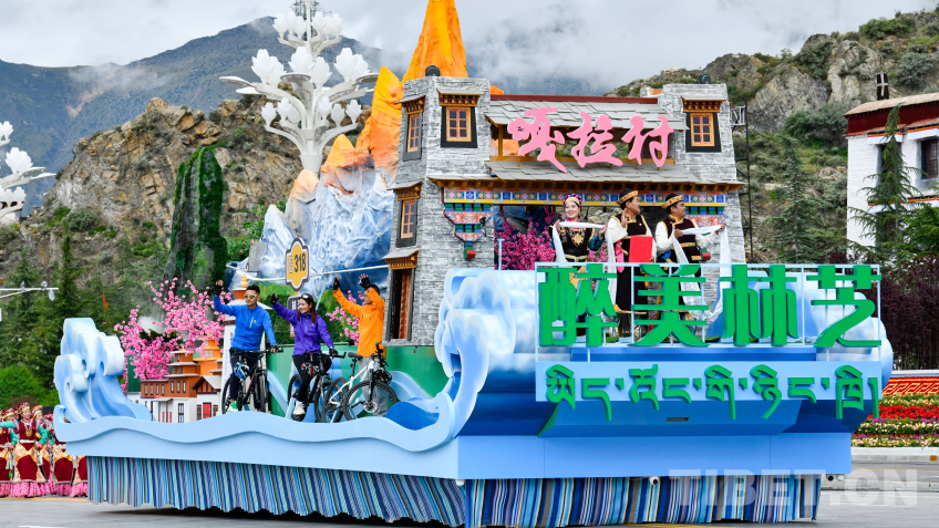 林芝市彩車,以雅魯藏布江造型托起林芝嘎拉村大門,村黨支部書記手捧習(xí)近平總書記的重要回信,表達(dá)了高原兒女對(duì)黨和國家的感恩、對(duì)習(xí)近平總書記的愛戴。
