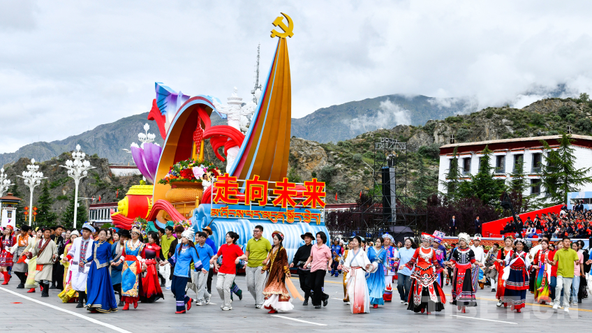 “走向未來”彩車,整體呈現(xiàn)數(shù)字“60”字樣,車身造型融入華表、紅色飄帶、中國結(jié)等元素,彰顯了西藏各族干部群眾奮進(jìn)新征程、建設(shè)團(tuán)結(jié)富裕文明和諧美麗的社會(huì)主義現(xiàn)代化新西藏的信心和決心。(中國西藏網(wǎng) 記者/王淑 趙振宇 德吉卓瑪 次旦拉姆 旦曲 賈華加 趙釗 姚浩然 劉莉 邊子捷 馮重霖 楊眉笑)