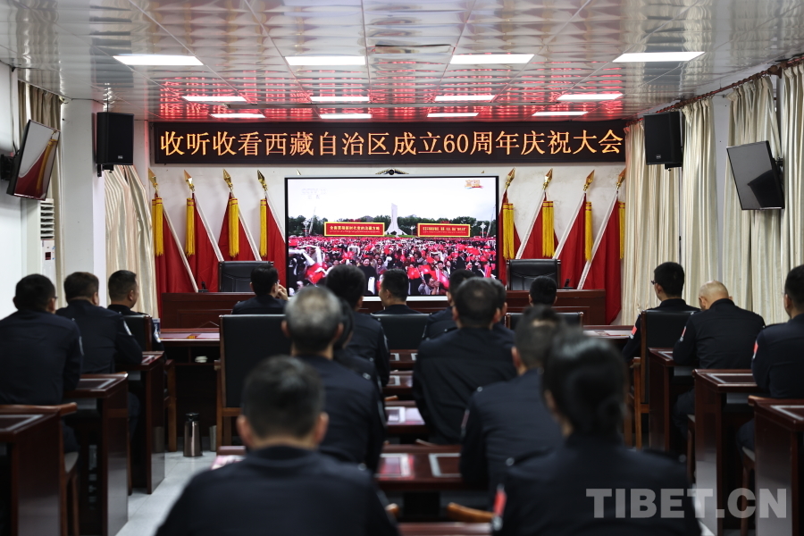 圖為基層民警觀看西藏自治區(qū)成立60周年慶祝大會