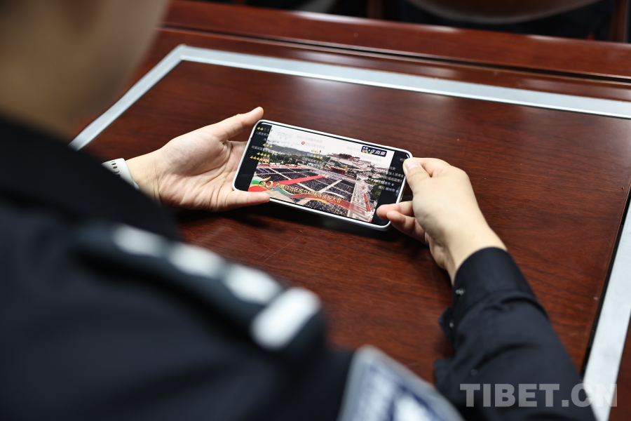 圖為聶拉木出入境邊防檢查站民警利用手機觀看西藏自治區(qū)成立60周年慶祝大會
